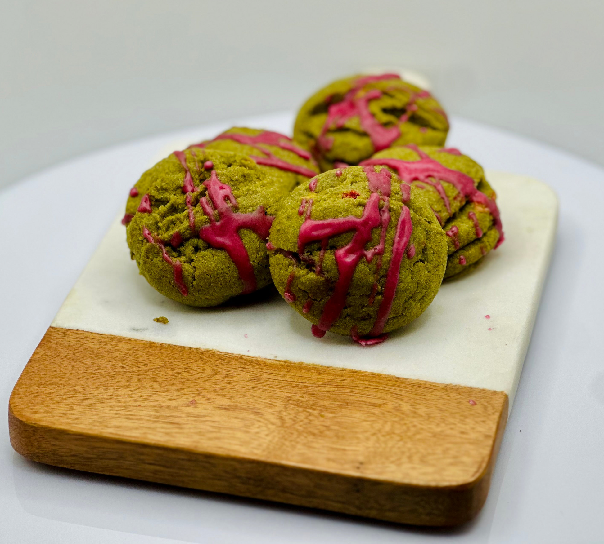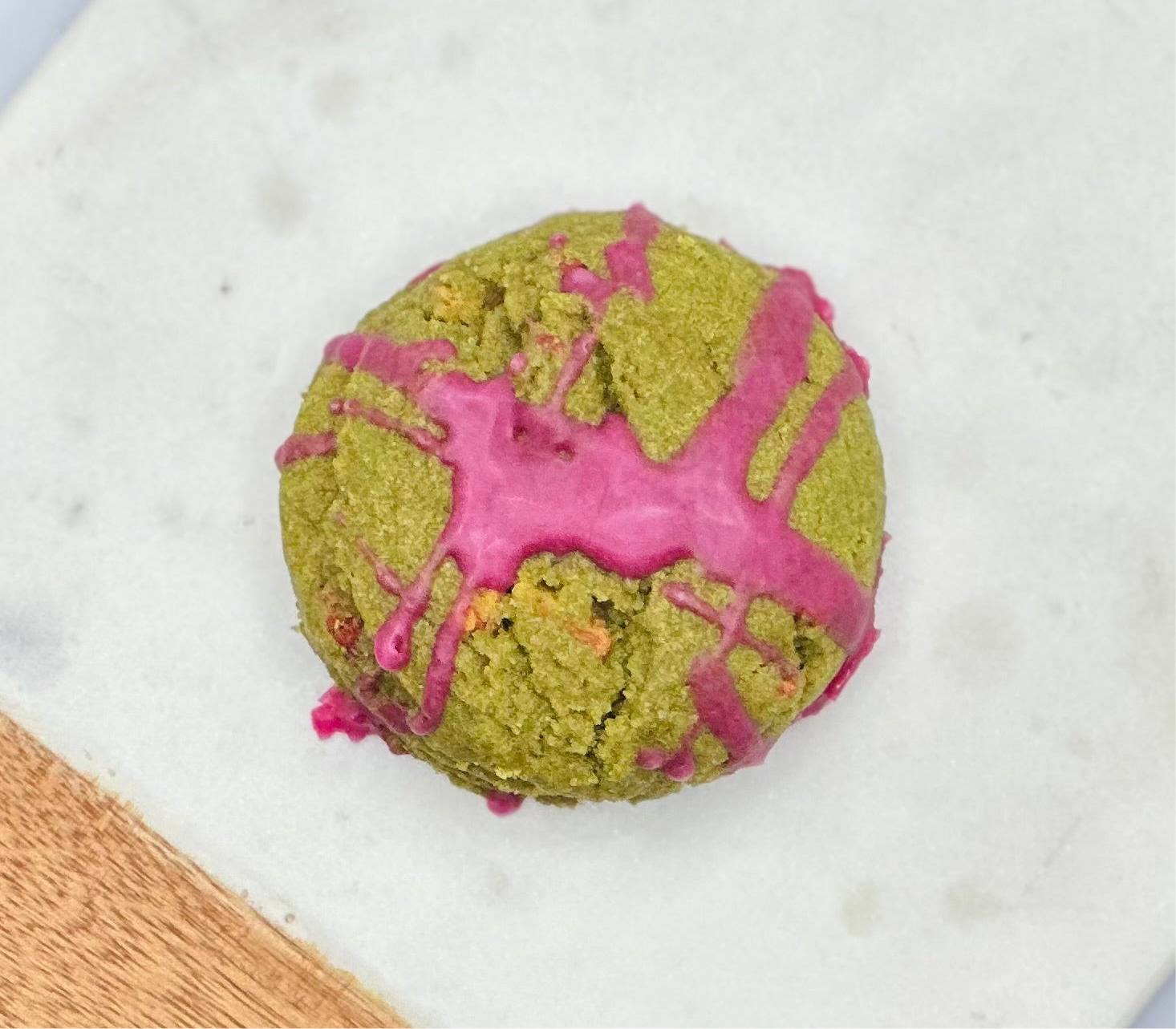 A flavor profile of earthy matcha base with a sweet counterbalance of strawberry and Dragon Fruit glaze embellishment.
